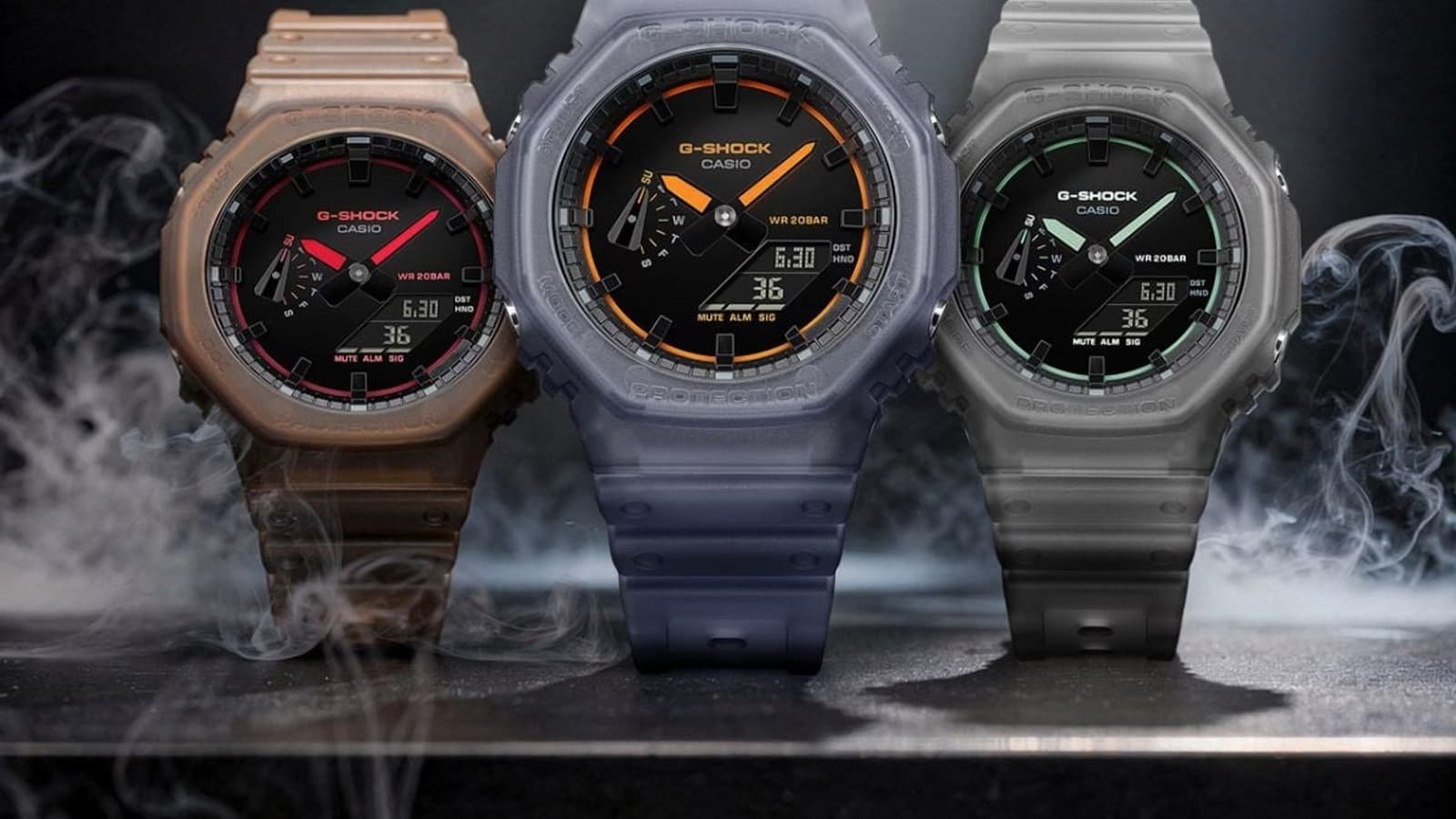 GA-2100K-1A получила серый полупрозрачный корпус и ремешок с бирюзовыми деталями, версия GA-2100K-2A выполнена в синей смоле с оранжевыми вставками, а GA-2100K-5A отличается коричневым полупрозрачным корпусом с красными акцентами. Все часы изготовлены из матовой полимерной смолы, которая контрастирует с глянцевой поверхностью циферблата.