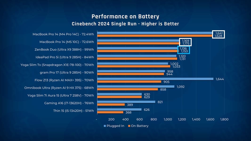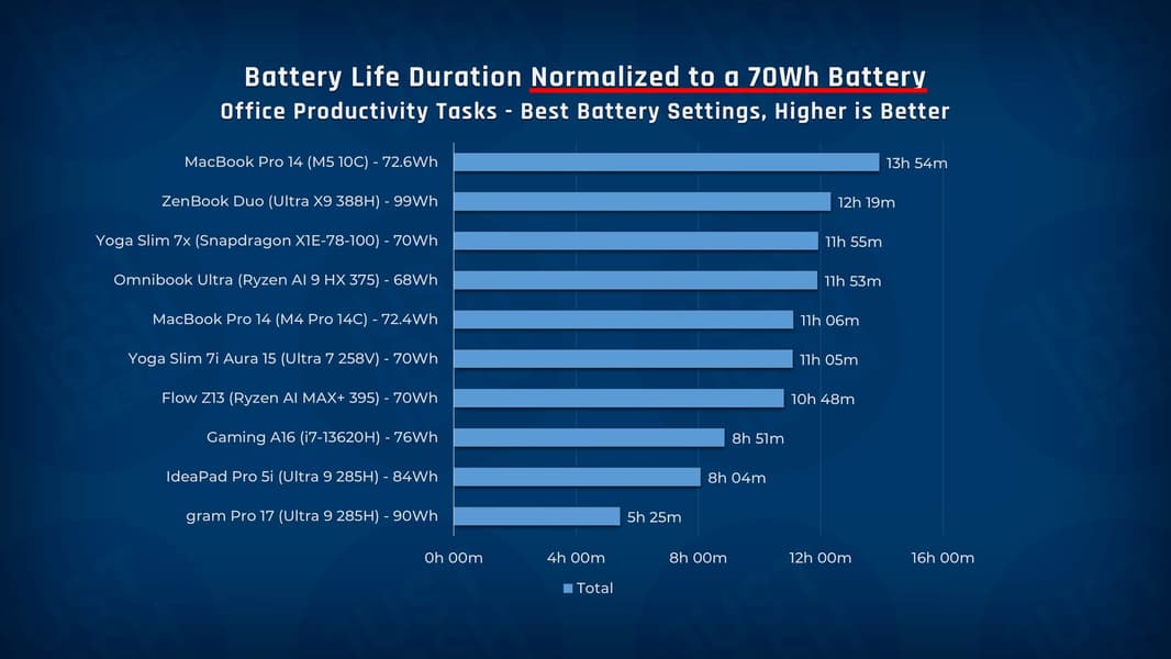 Как можно видеть, они более чем хороши. В этом случае ноутбук Asus ZenBook Duo оснащался аккумулятором ёмкость 99 Втч и в задачах офисного характера он умудрился заметно обойти даже MacBook Pro 14 на M5, не говоря уже о всех остальных конкурентов.
