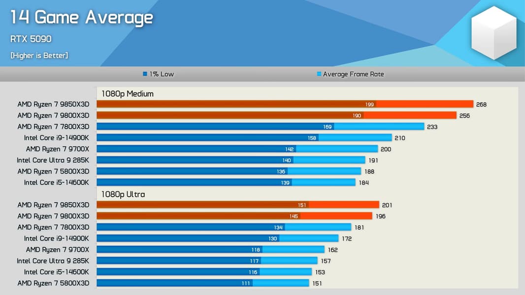 Все остальные CPU заметно отстают. Тот же Core i9-14900K новинка AMD опережает уже на немалые 17%, а Core Ultra 9 285K ещё медленнее. При этом нужно помнить, что такие результаты получены в Full HD при использовании RTX 5090, что далеко от типичных сценариев. Такие тесты нужны лишь, чтобы показать реальную разницу в производительности. Уже в 2K разница между CPU будет намного меньше, а в 4K она зачастую будет близка к нулю, не говоря уже о конфигурациях с менее производительными видеокартами.