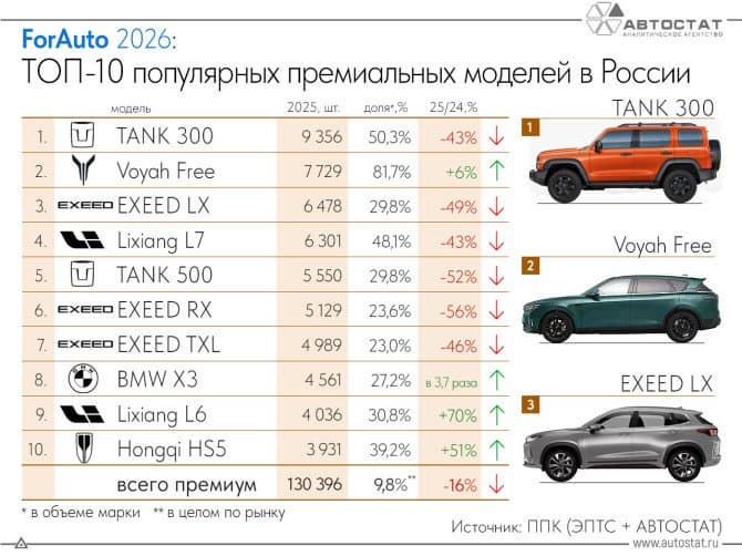По итогам 2025 года российский рынок новых премиальных автомобилей сократился на 16% до 130,4 тыс. единиц. Лидерство в модельном рейтинге сохранил внедорожник Tank 300 с результатом 9,4 тыс. проданных машин. На вторую строчку поднялся кроссовер Voyah Free (7,7 тыс. шт.), который обеспечил бренду более 80% всех продаж в стране.