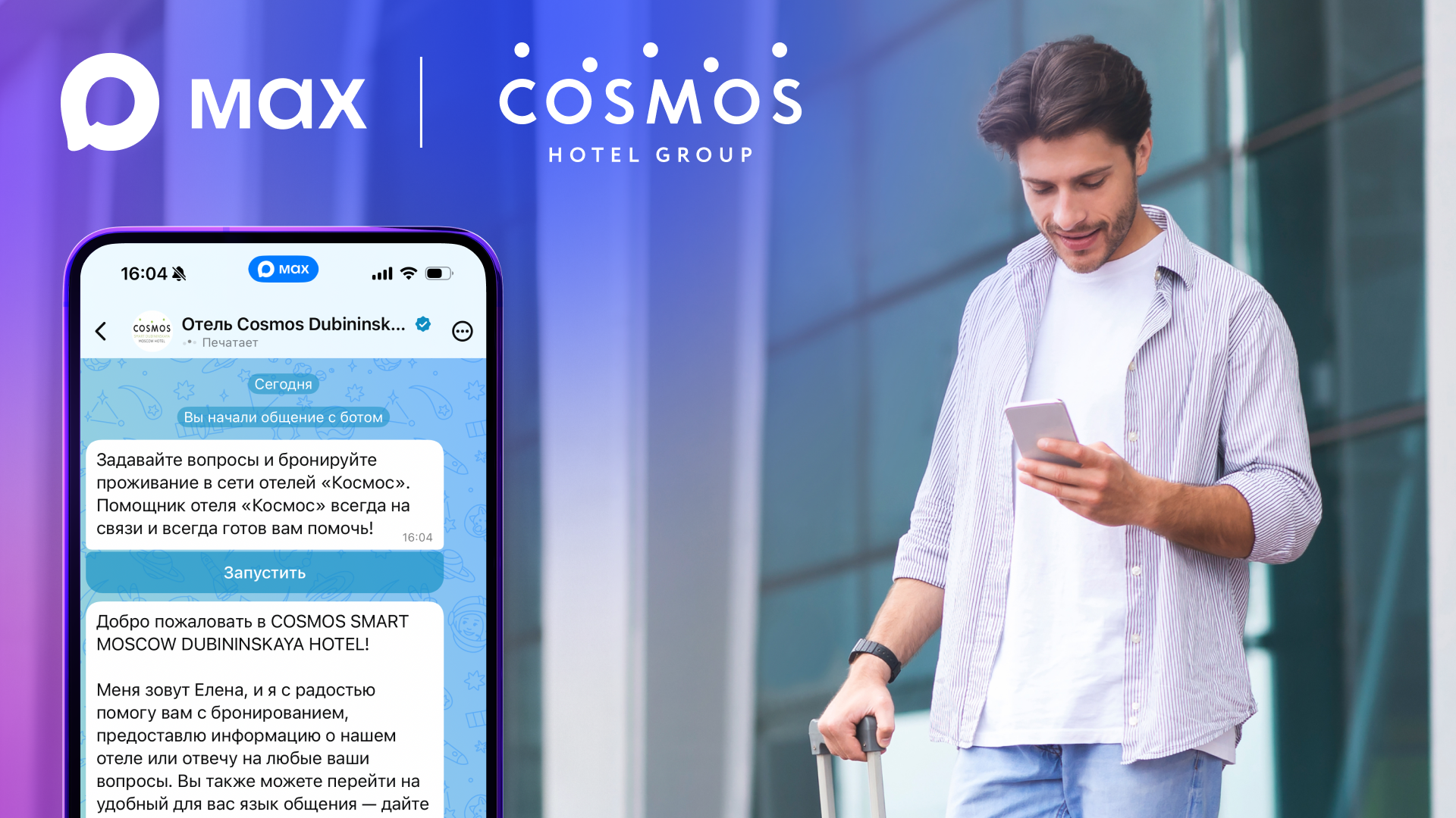 Сервис доступен в отеле Cosmos Smart Dubininskaya в Москве и будет постепенно внедрён в сети. Кроме онлайн-регистрации, в двух отелях сети уже работают чат-боты Max с функциями консультирования, подбора номеров, бронирования и оплаты.