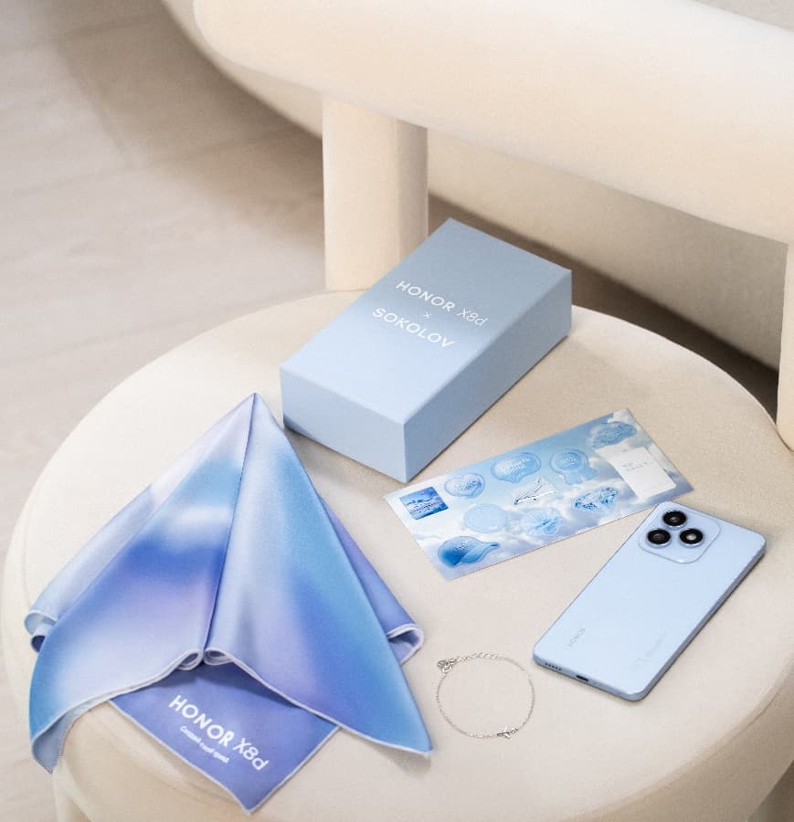 Honon и ювелирный бренд Sokolov сделали лимитированный набор аксессуаров, включающий платок, браслет Sokolov с парящим самолетом и стикеры для смартфона Honor X8d (обзор). Бокс предназначен для тех, кто купил этот смартфон на маркетплейсе (Яндекс Маркет, Озон или Wildberries). Для того, чтобы получить набор, покупатели должны написать «зарегистрировать покупку по почте ru.support@honor.com».