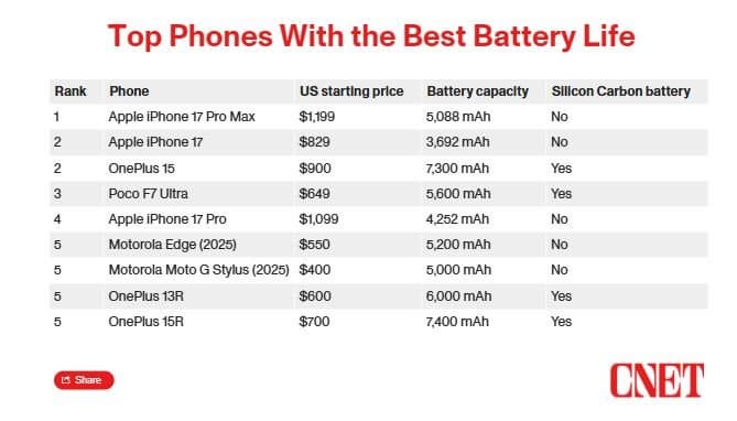 Издание Cnet опубликовало результаты комплексного тестирования аккумуляторов 35 моделей смартфонов. Тестирование включало два этапа: трехчасовой стриминг видео через Wi-Fi на максимальной яркости и 45-минутный «интенсив», имитирующий реальную нагрузку (игры, видеозвонки и социальные сети). Безоговорочным лидером рейтинга стал iPhone 17 Pro Max, оснащенный батареей емкостью 5088 мАч.
