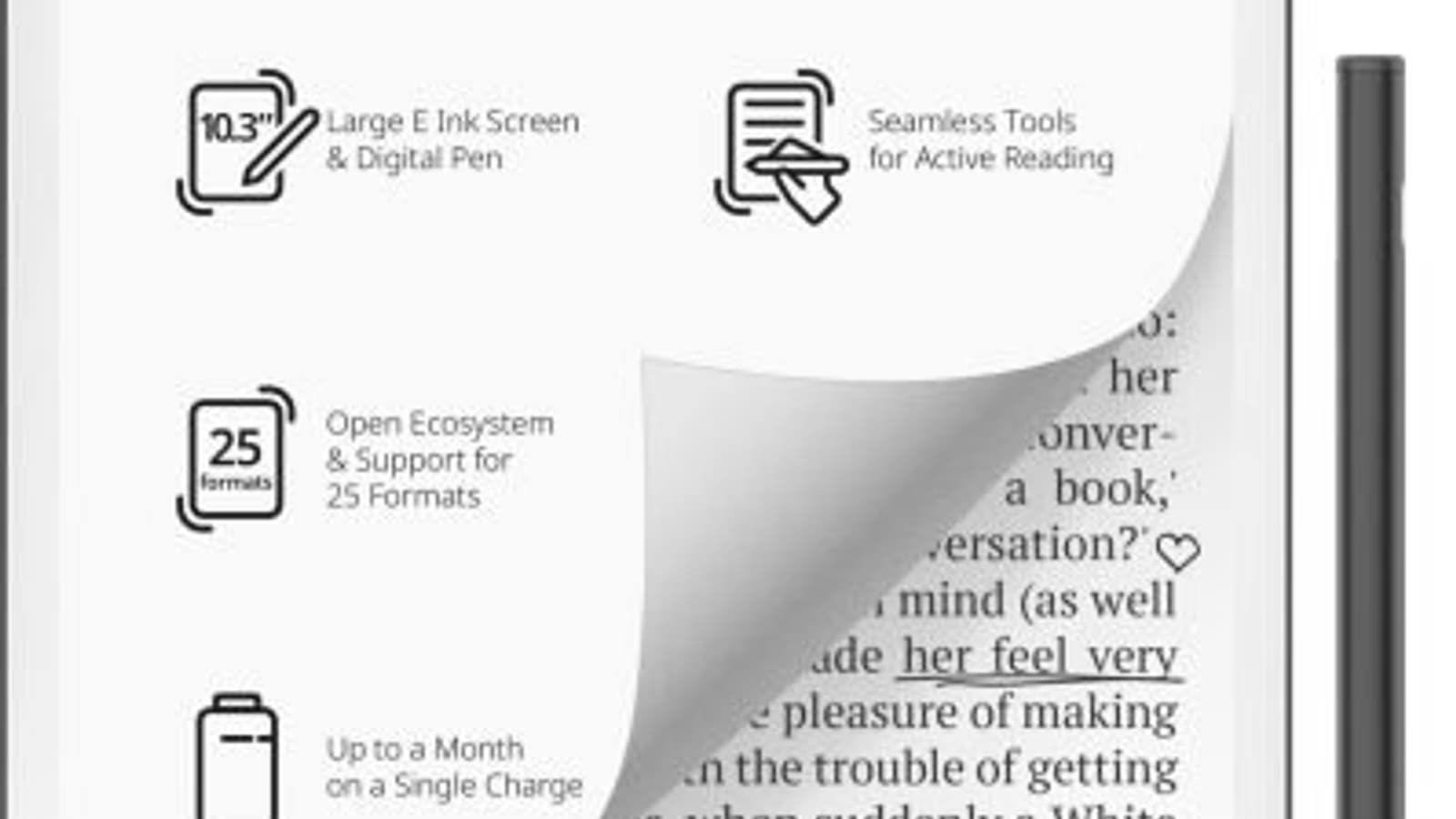 В основе лежит дисплей E Ink Mobius с плотностью 226 пикселей на дюйм. Он способен отображать 16 оттенков серого и имеет настраиваемую подсветку.