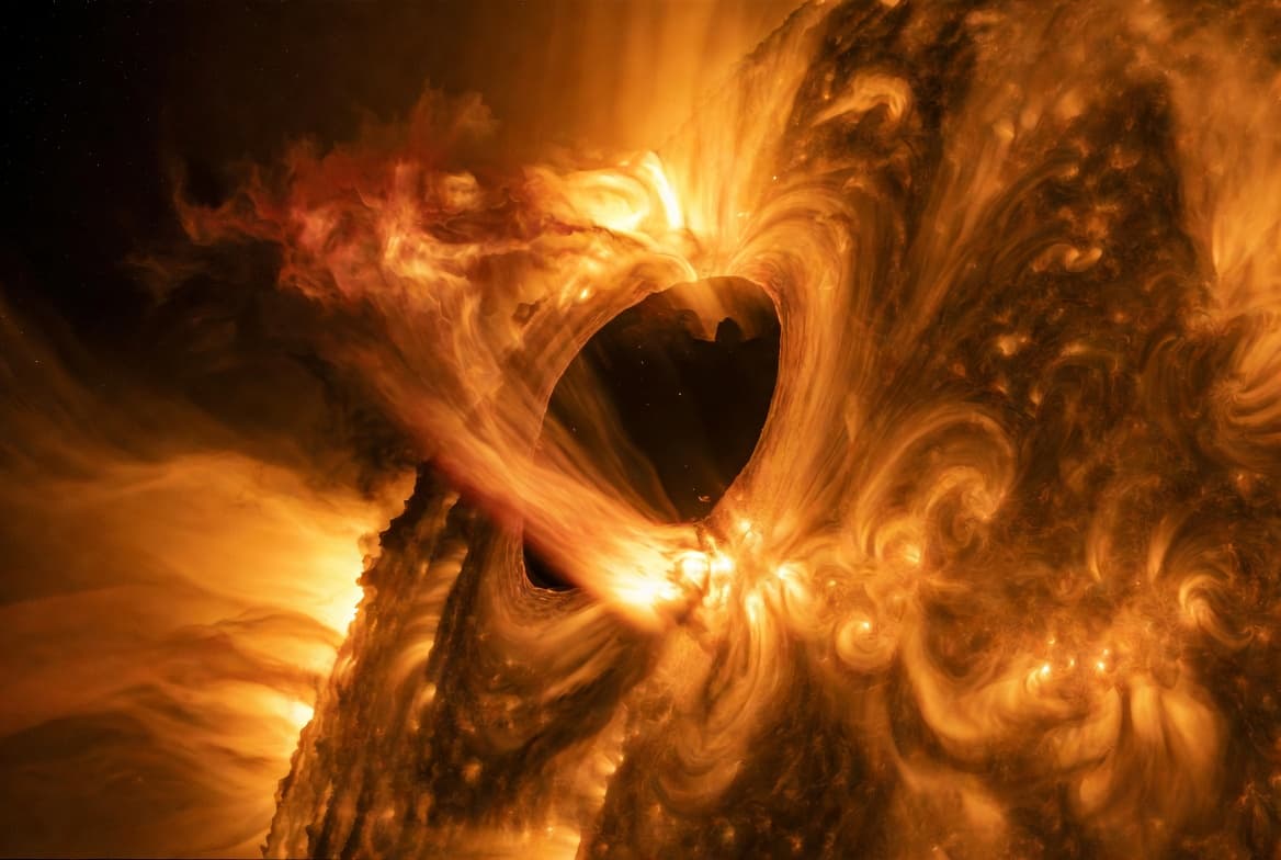Корональные дыры представляют собой области с пониженной плотностью плазмы, из которых в космическое пространство уходит ускоренный солнечный ветер. При достижении Земли такие потоки могут вызывать геомагнитные возмущения различной силы.