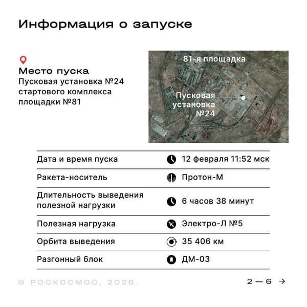 На космодроме Байконур возобновляются пуски ракет-носителей тяжелого класса «Протон»: сегодня, 12 февраля, в 11:52 по московскому времени «Протон-М» стартует с площадки № 81 Байконура с метеоспутником «Электро-Л» №5. Предстоящий старт станет знаковым для российской космической отрасли по нескольким причинам: во-первых, это первый запуск ракеты данного типа почти за три года (предыдущий состоялся в 2023 году), а во-вторых, этот полет станет завершающим для разгонных блоков типа ДМ.