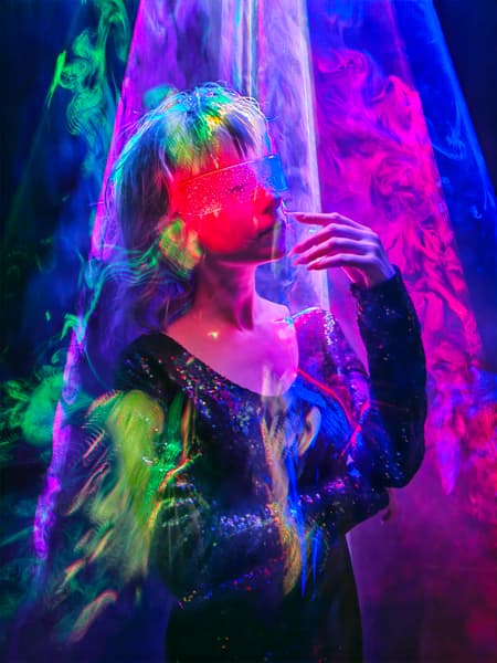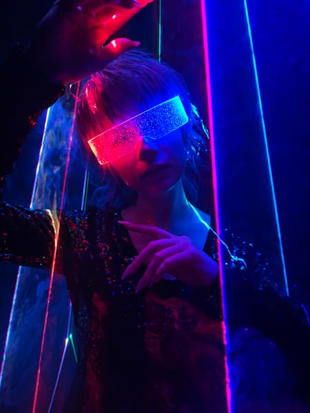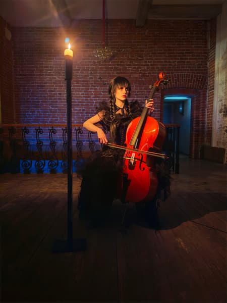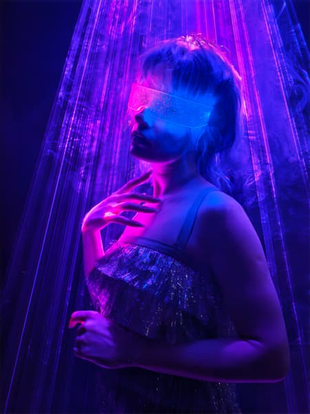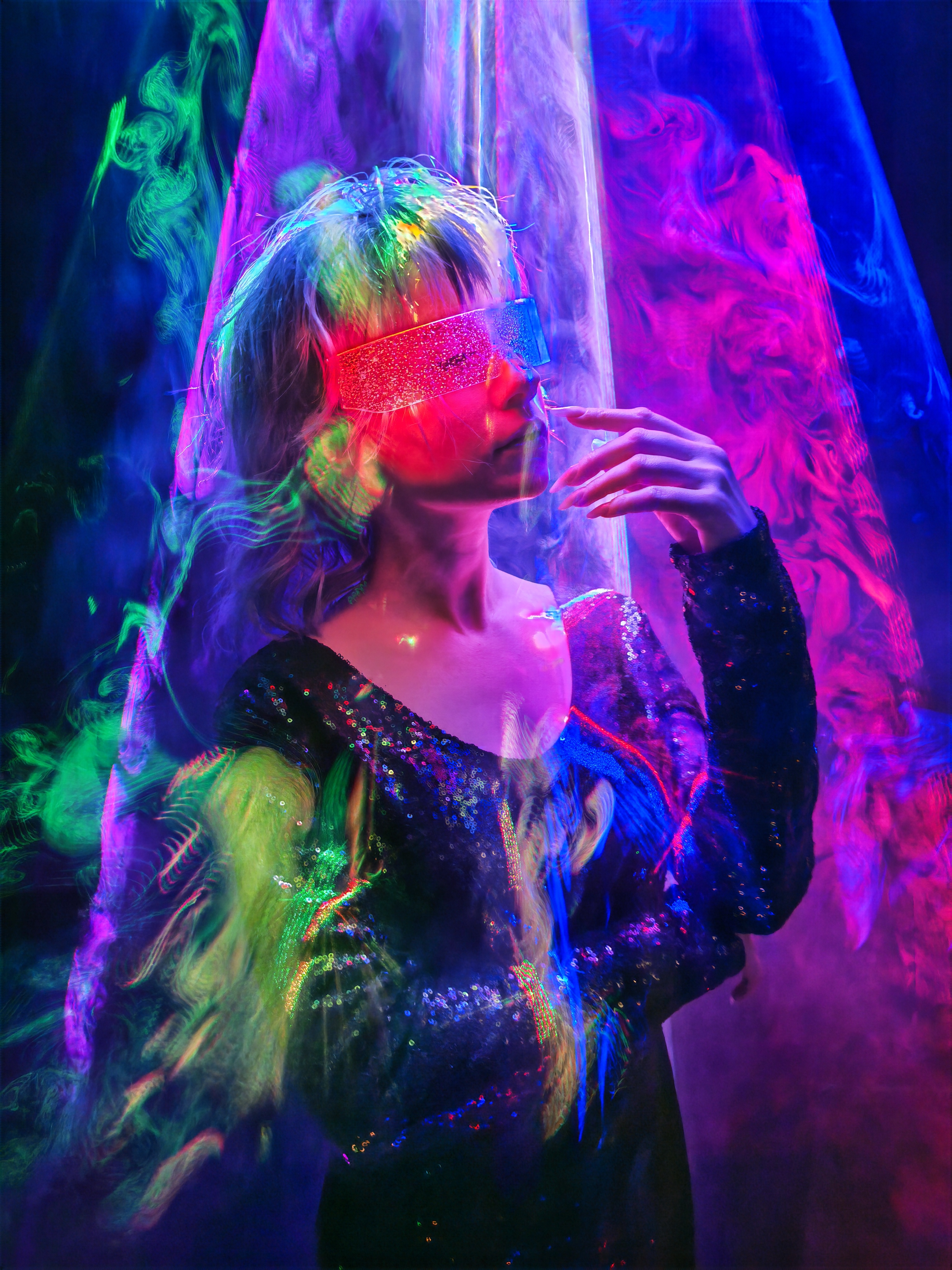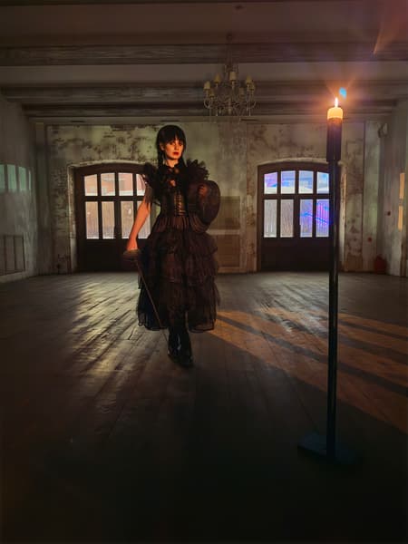На первую сцену фотографа вдохновила игра Cyberpunk 2077, это была серия неоновых портретов. Вторая — в стиле неоготики — создана по мотивам сериала «Уэнсдей».