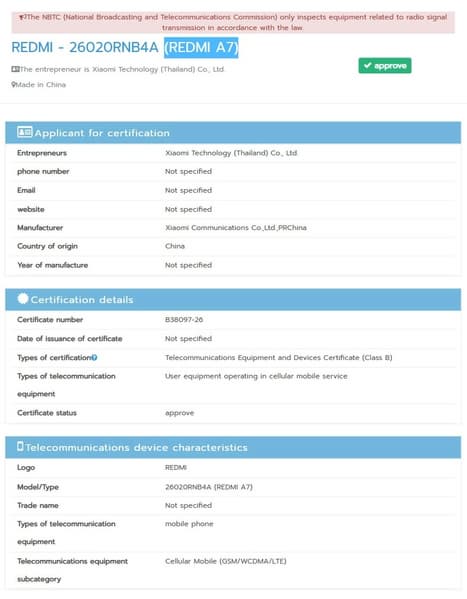 Xiaomi готовится к глобальному запуску новой линейки смартфонов начального уровня — Redmi A7 и Redmi A7 Pro. Стандартная модель уже прошла сертификацию в Таиланде (NBTC) и Евросоюзе (EEC) с каталожным номером 26020RNB4A.