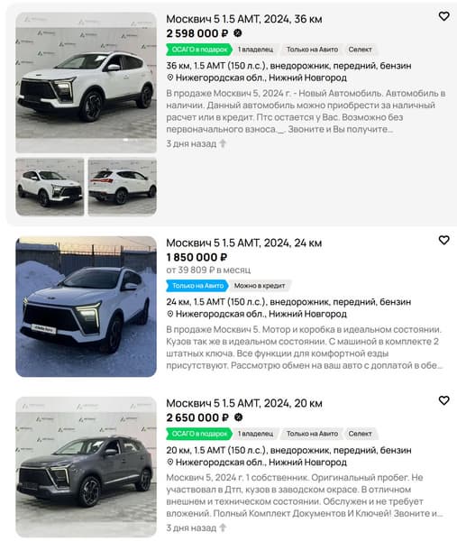 Выставленные на продажу автомобили 2024 года выпуска имеют минимальный пробег 20-30 километров. Цена самого доступного экземпляра составляет 1,85 млн рублей, две другие машины предложены за 2,6 и 2,65 млн рублей.