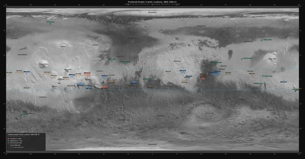 Все события группируются вблизи марсианских равноденствий и в пределах ±9° от экватора, что связано с орбитальными наклонами спутников. Теоретический предел для наблюдателя составляет ±13,1° широты: выше этой зоны двойные транзиты невозможны. Следующее частичное событие ожидается 17 апреля 2034 года, а ближайший полный двойной транзит — только 20 ноября 2118 года, когда оба спутника окажутся полностью на диске Солнца на фоне плато Большой Сирт (Syrtis Major).