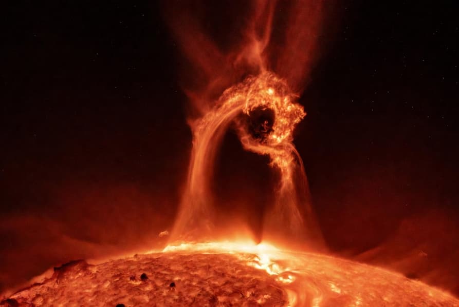 На Солнце зафиксирован отрыв колоссального протуберанца, направленного в сторону северного полюса звезды. Размер плазменной структуры вблизи поверхности достиг примерно одного миллиона километров — это втрое больше расстояния от Земли до Луны. Подобные масштабные выбросы уже наблюдались в прошлом году, последний раз о них сообщалось в ноябре.
