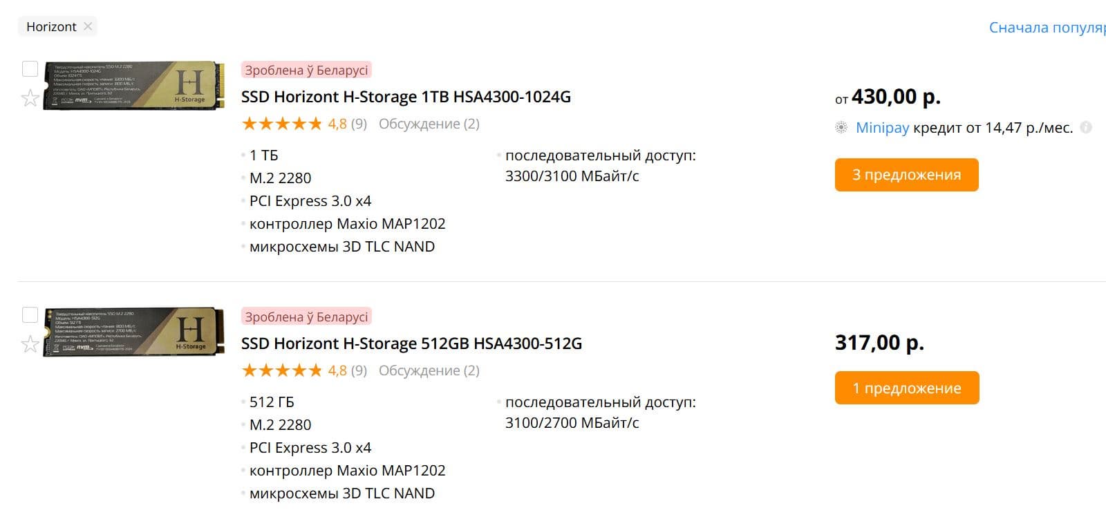 Белорусское предприятие «Горизонт» запустило производство твердотельных накопителей под собственным брендом. На данный момент предлагаются две модели — с каталожными номерами HSA4300-1024G и HSA4300-512G. Объемы памяти, соответственно, 1 ТБ и 512 ГБ.