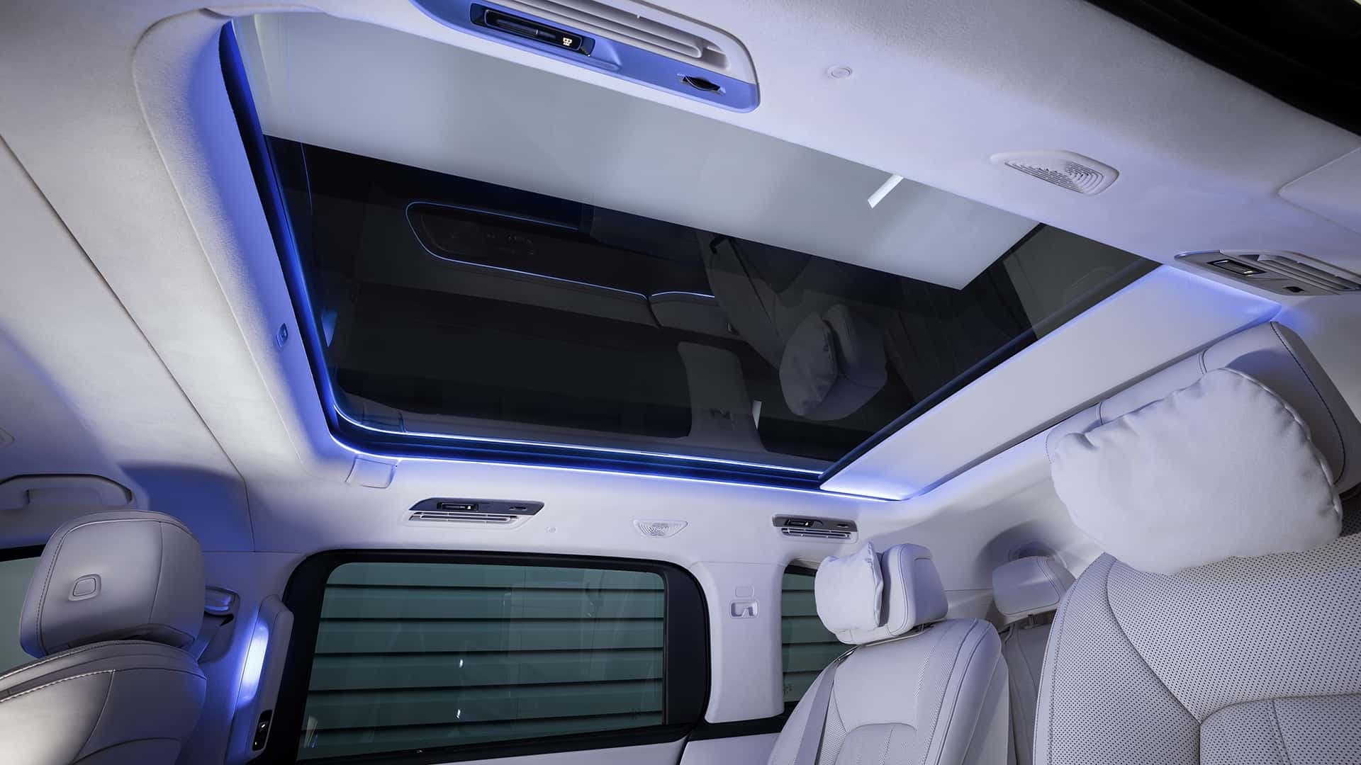 Передняя панель может быть оснащена комплексом MBUX Superscreen (10,25-дюймовая приборная панель и два 14-дюймовых дисплея). Но главный упор сделан на заднюю часть салона, доступную в конфигурациях от шести до восьми мест. Там установлен откидной панорамный экран диагональю 31,3 дюйма (с разрешением 8K и встроенной 8-мегапиксельной камерой). Пассажирам доступны кресла Grand Comfort с массажем, электроприводами (управляемыми со смартфона), подставками для ног. Также предусмотрена панорамная крыша Sky View, акустика Burmester 3D с 22 динамиками, раскладные столики и отсеки с охлаждением.