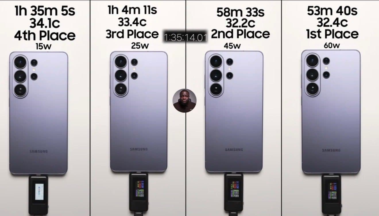 YouTube-канал Lover Of Tech провел довольно интересный тест: Galaxy S26 Ultra протестировали с зарядками разной мощности — 15, 25, 45 и 60 Вт. Ключевым новшеством новой модели стала зарядка мощностью 60 Вт, до этого ни одно поколение Ultra использовало 45-ваттную зарядку.