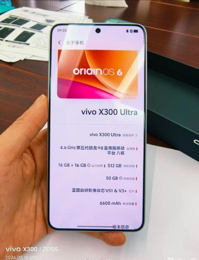 Зато одно из фото позволяет нам оценить характеристики. В частности, SoC Snapdragon 8 Elite Gen 5, 16/512 ГБ памяти, наличие чипов V1S и V3 собственной разработки Vivo и аккумулятор ёмкостью 6600 мАч. Не самый большой, но у X200 Ultra было на 600 мАч меньше.