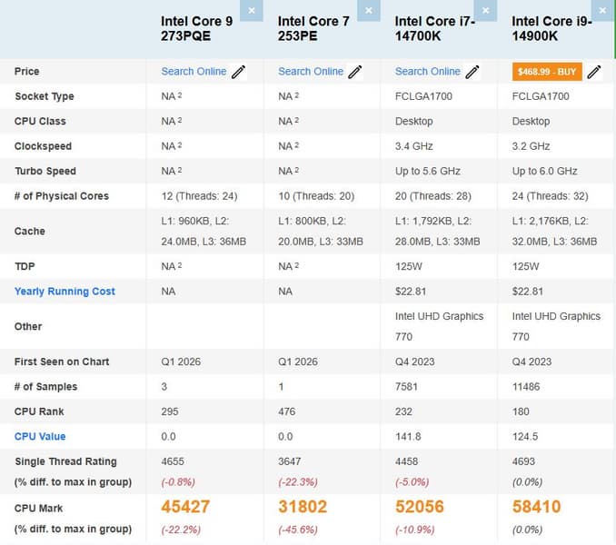 Согласно данным PassMark, Intel Core 9 273PQE набрал 45 427 баллов в многопоточном тесте и 4655 баллов в однопоточном. Для процессора с 12 ядрами и 24 потоками это внушительный результат: в многопотоке Core 9 273PQE отстаёт от Core i7-14700K примерно на 12%, а от Core i9-14900K — примерно на 22%. При этом в однопоточном режиме новинка даже немного опережает Core i7-14700K и практически вплотную подходит к Core i9-14900K.