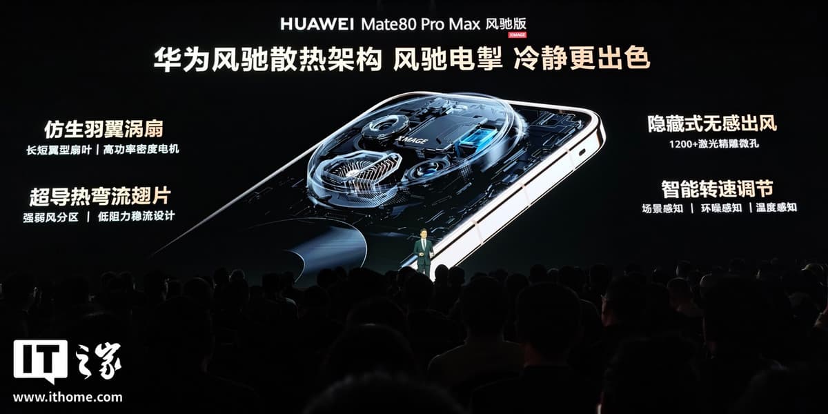 Huawei сегодня официально представила флагманский смартфон Mate 80 Pro Max Fengchi Edition (он же Fan Edition), особенностью которого стала интегрированная система охлаждения Fengchi. Это скрытая система, и, по заверениям Huawei, она не ощущается при использовании. В конструкции также применён вентилятор с асимметричными лопастями и высокомощный (по меркам смартфона) мотор. По данным Huawei, это решение увеличивает воздушный поток на 60% при минимальном уровне шума. Дополняют систему специальные теплопроводящие изогнутые рёбра, которые должны повышать эффективность отвода тепла.
