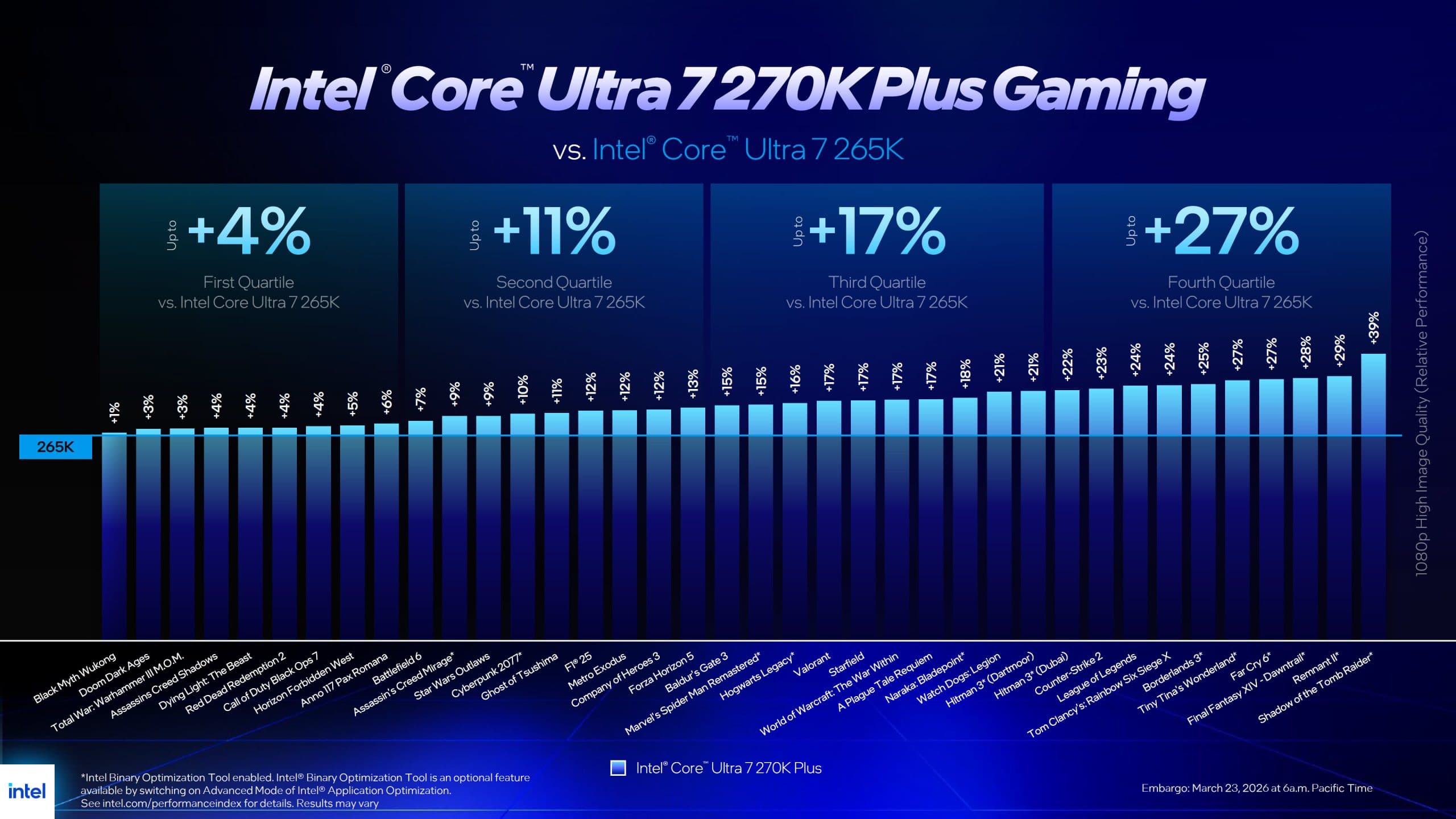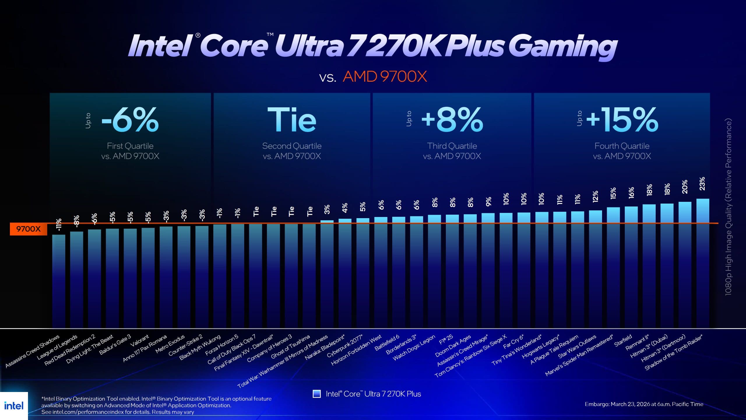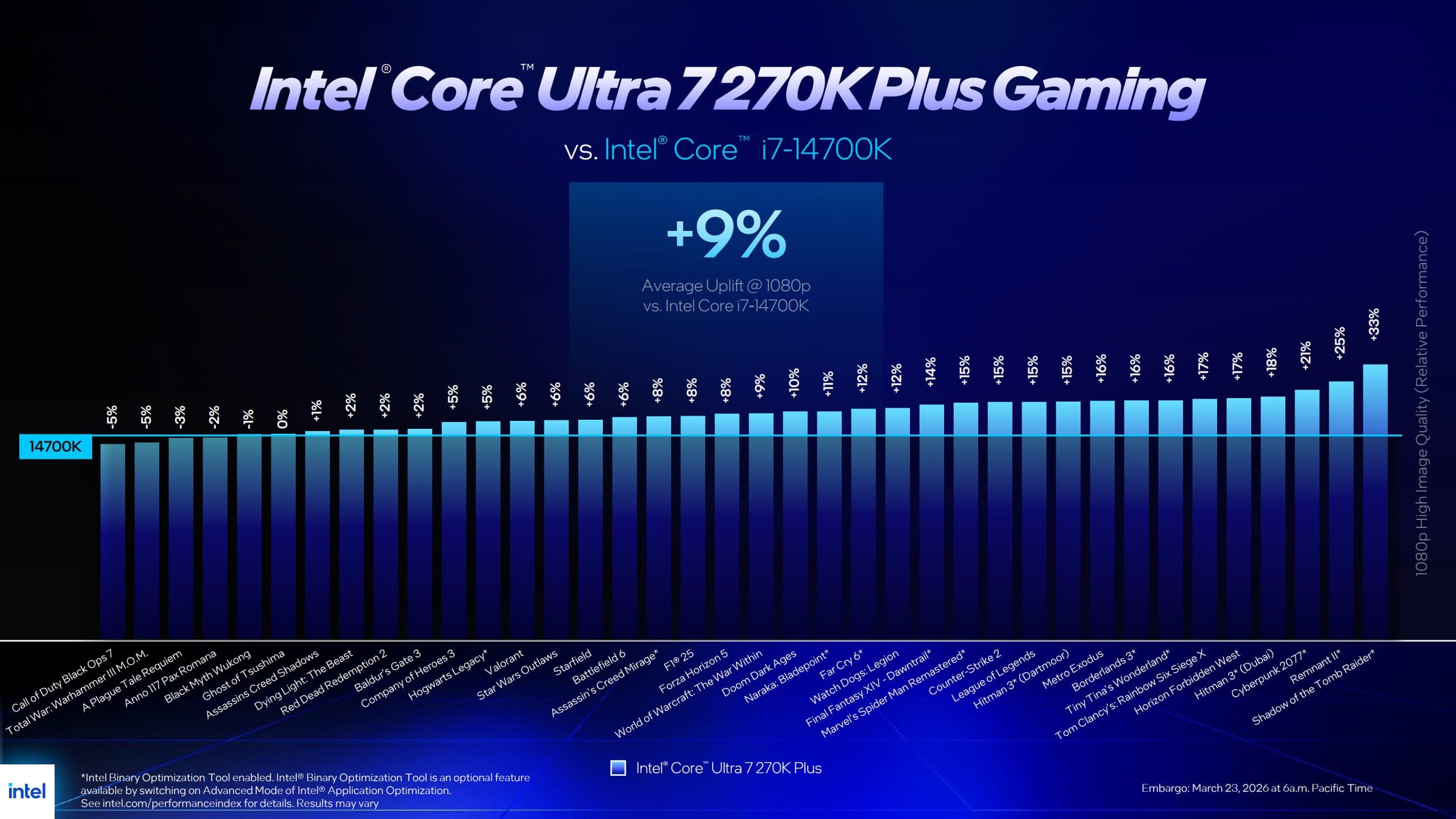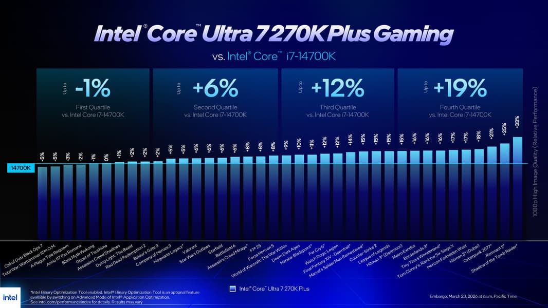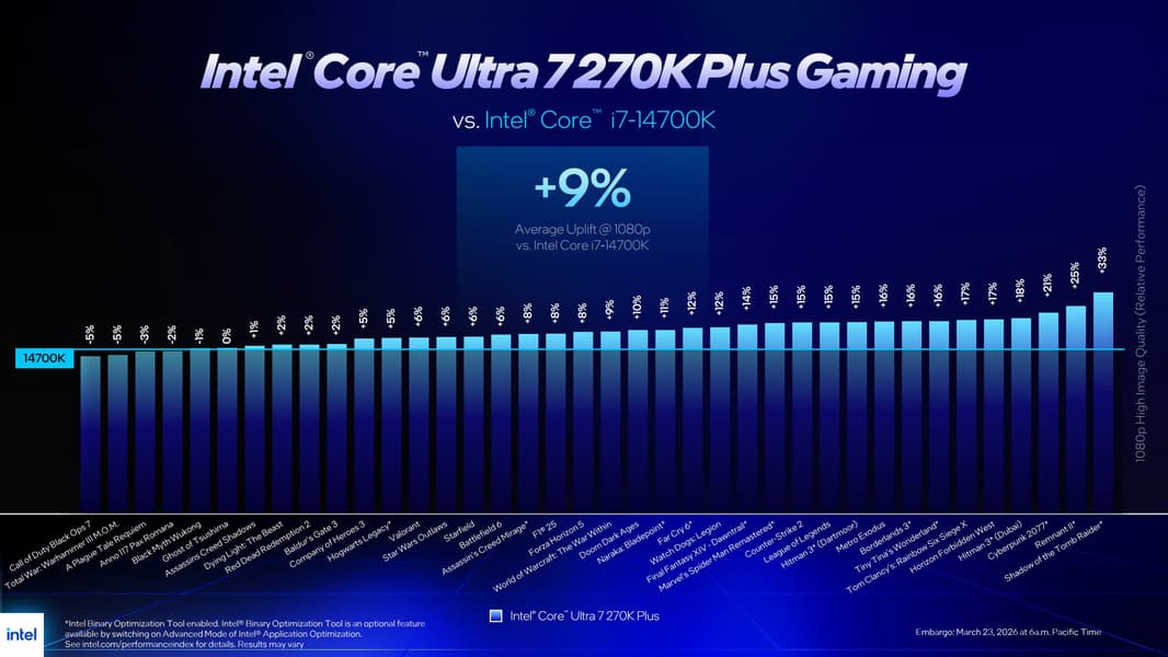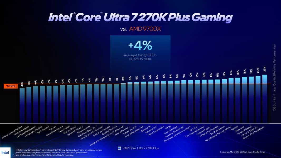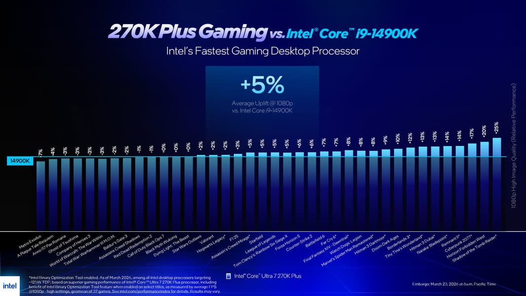 Оцененный в 300 долларов Core Ultra 7 270K Plus, согласно данным Intel, в играх при разрешении 1080p в среднем на 15% быстрее, чем Core Ultra 7 265K, на 9% быстрее, чем Core i7-14700K, и примерно на 5% быстрее, чем Core i9-14900K. В сравнении с AMD Ryzen 7 9700X, который стоит те же 300 долларов, Intel заявляет преимущество в среднем около 4% в играх.