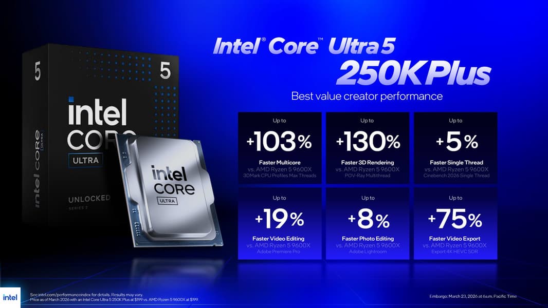 Младшая модель Core Ultra 5 250K Plus за 200 долларов сопоставима по производительности с Ryzen 5 9600X, который тоже стоит 200 долларов. По игровым тестам производительность этих двух CPU практически одинакова, но есть разница в приложениях. Intel заявляет, что в сравнении с Ryzen 5 9600X новый Core Ultra 5 250K Plus на 103% быстрее в многопотоке, на 130% быстрее в 3D-рендеринге, на 19% быстрее в видеомонтаже, на 8% быстрее в обработке фото и на 75% быстрее при экспорте видео.