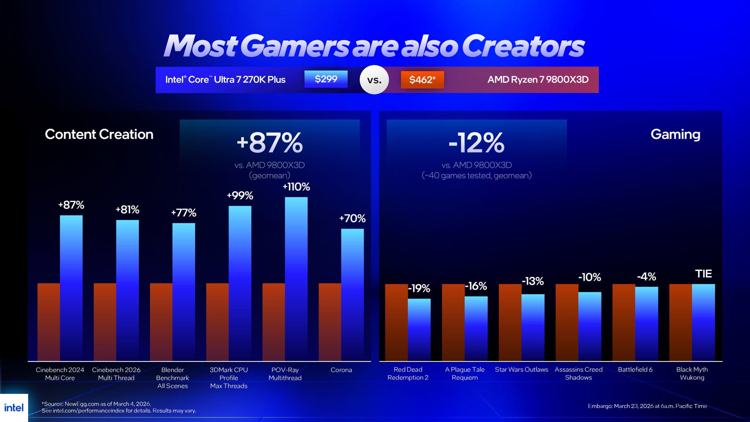 То же справедливо и для Core Ultra 7 270K Plus. В многопоточных и профессиональных задачах, где активно используются дополнительные ядра и потоки, Intel обещает до двукратного превосходства над сопоставимыми Ryzen. В частности, в ряде бенчмарков, включая Cinebench, SPECWorkstation, Blender и PugetBench, Core Ultra 7 270K Plus уверенно опережает Ryzen 7 9700X.