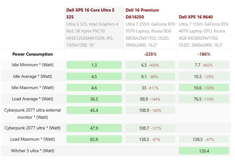 Тестовая модель опиралась на CPU Core Ultra 5 325 и не имела дискретной видеокарты. В режиме ожидания с включённой технологией VRR и яркостью экрана на отметке в 150 кд/кв.м уровень энергопотребления в режиме ожидания варьировался от 1,5 до 4,6 Вт со средним показателем в 4,5 Вт. Для сравнения, аналогичные ноутбуки Dell двух прошлых поколений на процессорах Core Ultra 200 и Core Ultra 100 в среднем потребляли 8,1 и 10,3 Вт с максимальными показателями 33 и 10,6 Вт соответственно. Минимальные показатели у них не опускались ниже 6,5 и 7,7 Вт.