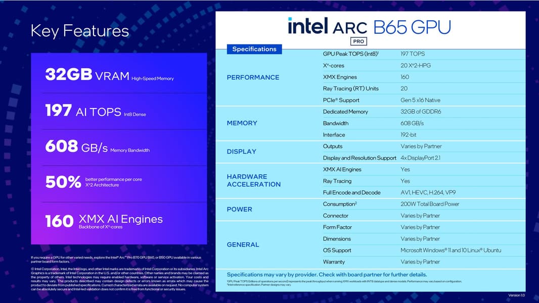 Младшая Arc Pro B65 использует урезанную конфигурацию того же GPU — 20 Xe-ядер, частота графического процессора — 2,4 ГГц. Разрядность шины памяти составляет 192 бита, энергопотребление — до 200 Вт, производительность — 197 TOPS.