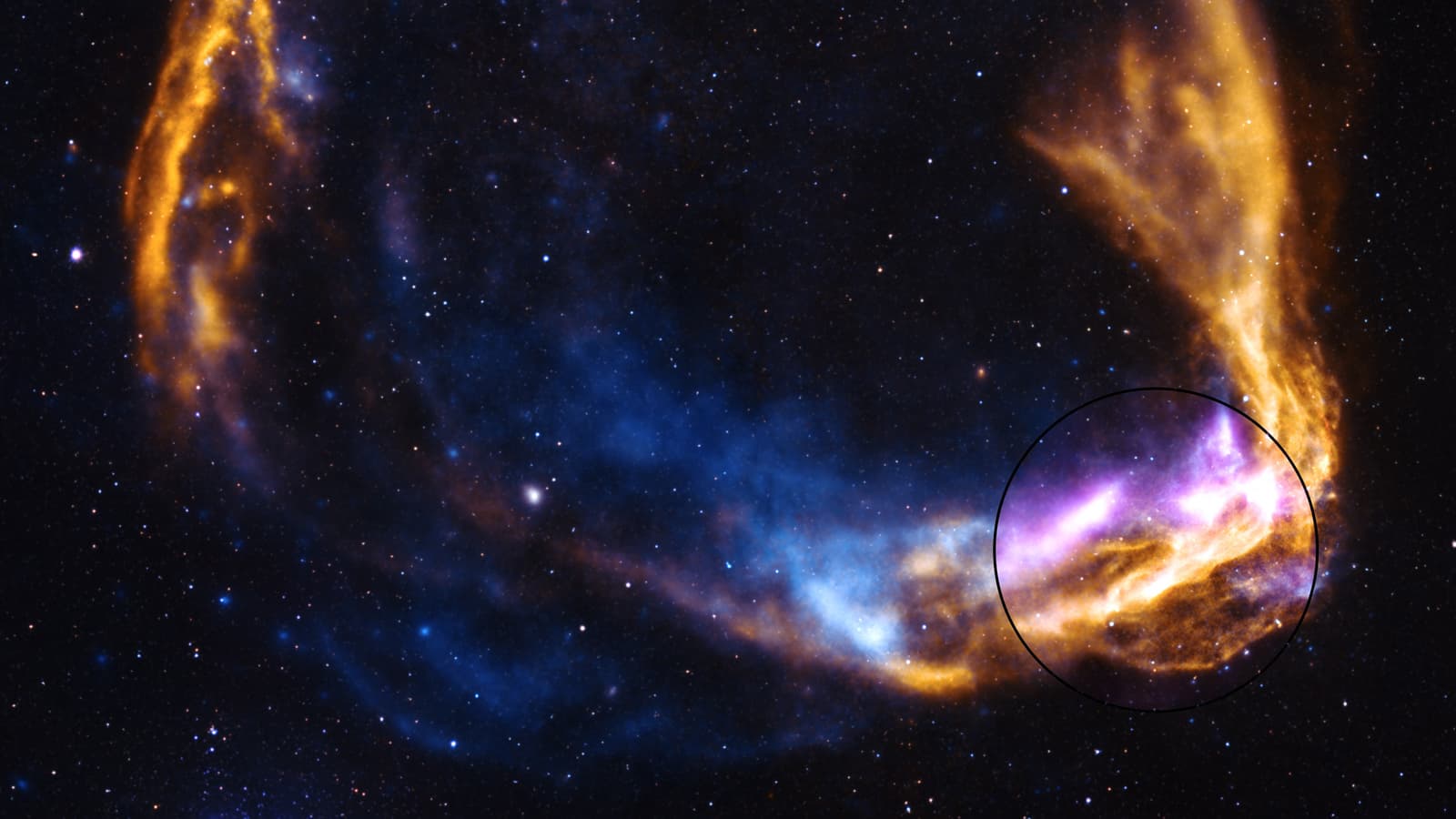 Новые данные IXPE сосредоточены на внешнем крае остатка, где расширение, вероятно, остановилось на границе каверны, создавая эффект отражённого удара. На изображении, объединяющем данные IXPE, Chandra и XMM-Newton, фиолетовым цветом выделены области отражённого удара, жёлтым — низкоэнергетические рентгеновские лучи, а синим — высокоэнергетические.