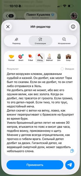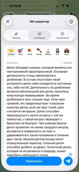 С его помощью можно быстро исправить грамматику, переписать текст в другом стиле или перевести сообщение на другой язык. Редактор работает на ИИ с открытым исходным кодом, а все запросы обрабатываются в защищённой среде Cocoon Network без доступа к данным пользователей. Функция доступна подписчикам Premium.