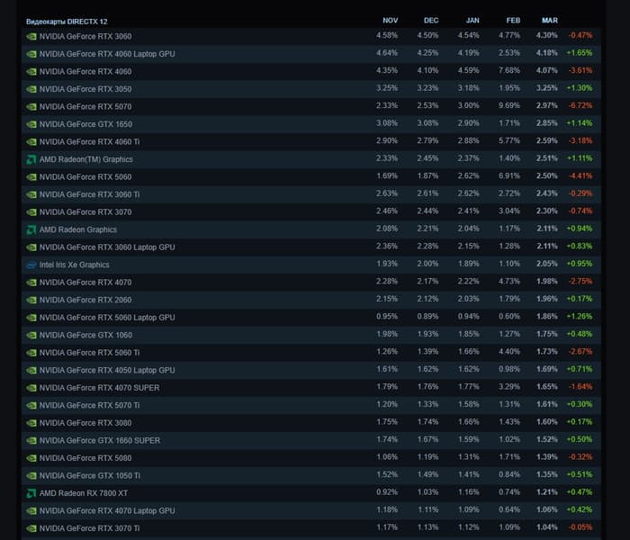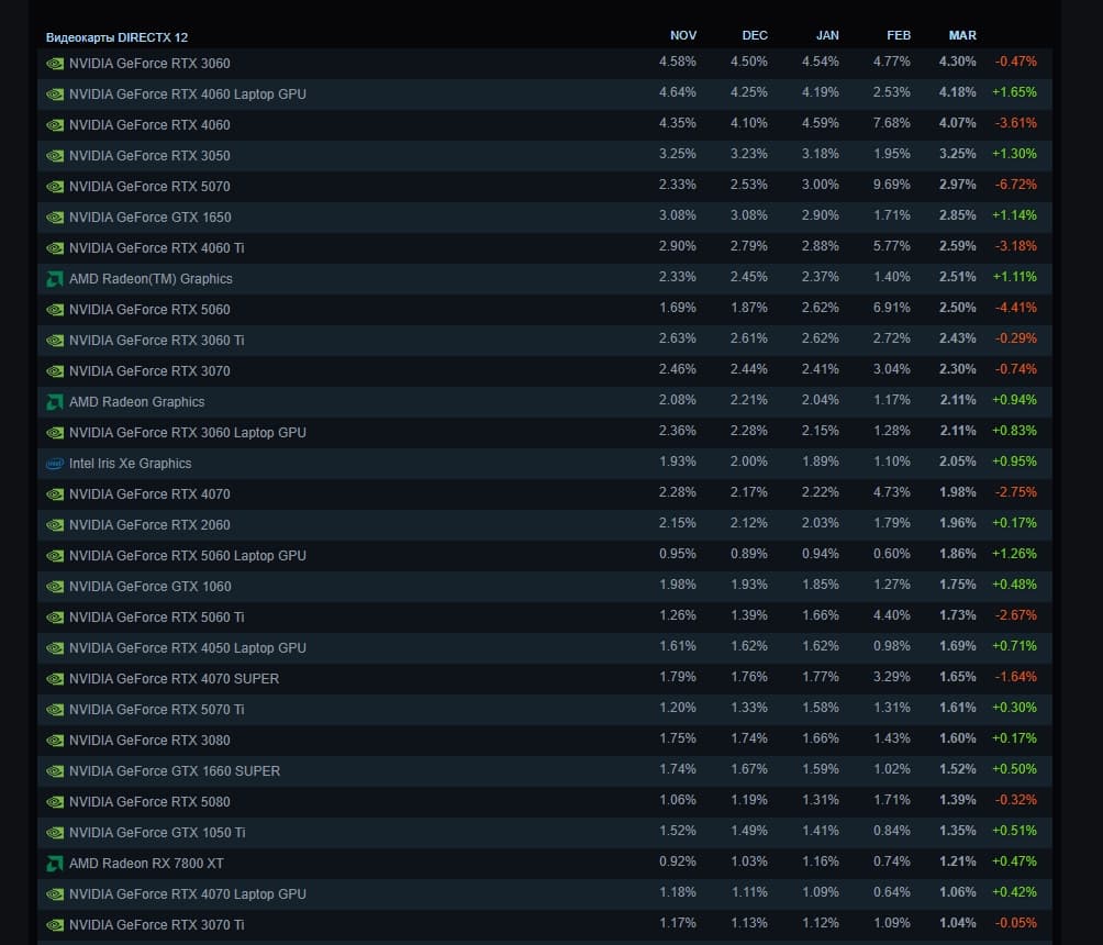 Так или иначе, у неё 4,3%, что немного ниже показателя января (февраль можно пропустить). На втором месте RTX 4060 Laptop, а настольная версия стоит на третьем. Та самая RTX 5070 вернула себе свои 3%, которые были у неё в январе, и опустилась на пятое. Хотя это всё равно отлично для актуальной карты ещё и не самой доступной. Особенно на фоне затягивающегося лидерства RTX 3060.