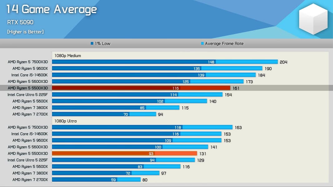 Так или иначе, если не рассматривать средние настройки графики, так как это совсем уж далеко от реальности, то можно видеть, что Ryzen 5 5500X3D несколько уступает Ryzen 5 5600X3D и примерно на столько же обходит Ryzen 5 5600X, играя на одном уровне с Core Ultra 5 225F.