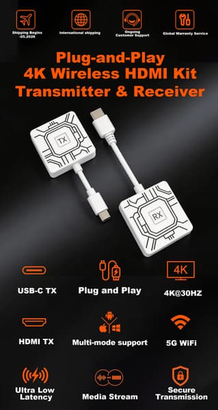Комплект состоит из передатчика и приемника и использует схему plug-and-play: пользователю достаточно подключить питание и видеовыход, после чего система должна начать работу без сложной настройки. Передача поддерживает разрешение 4K с кадровой частотой 30 Гц или Full HD с кадровой частотой 60 Гц.
