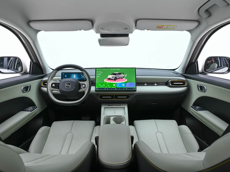 Chery QQ3 EV получил довольно современный набор оснащения. В автомобиле установлена медиасистема с экраном диагональю 15,6 дюйма и разрешением 2,5К, в основе аппаратной платформы лежит SoC Qualcomm Snapdragon 8155. Передние сиденья имеют подогрев и вентиляцию, в оснащение входят умное косметическое зеркало с настройкой цветовой температуры, Bluetooth-ключ.