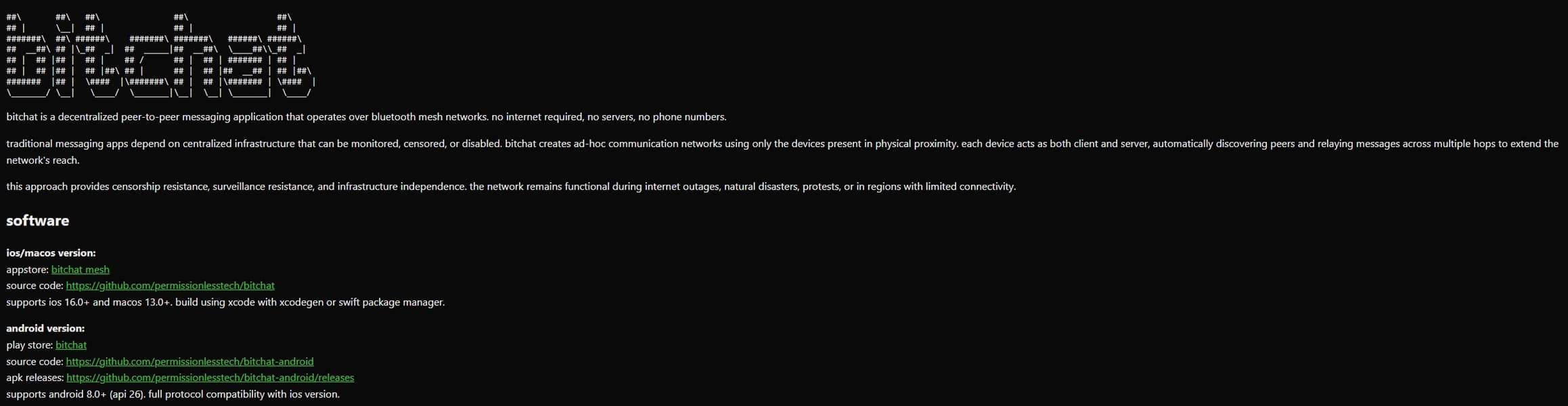 Bitchat такую проверку вряд ли проходил, так как, напомним, он работает вообще вне интернета. Это мессенджер с открытым исходным кодом, представляющий собой приложение для обмена сообщениями, которое для соединения пользователей использует Bluetooth, то есть использует принцип ячеистых сетей.