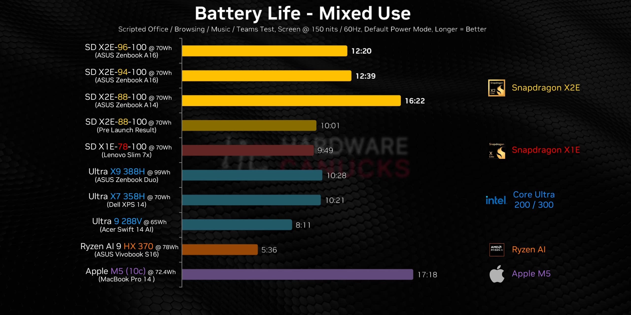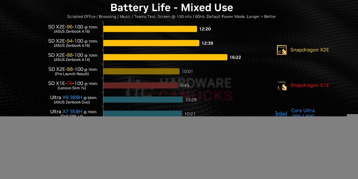 Стоит для начала отметить, что тесты проходила 30-ваттная версия чипа. И с автономностью в этом случае всё очень хорошо. В тестах Hardware Canucks ноутбуки Asus с батареями ёмкостью 70 Втч смогли опередить всех конкурентов с Windows, а одна из моделей почти дотянулась до MacBook Pro M5. То есть с автономностью у ноутбуков на Snapdragon X2 всё очень хорошо, но благодаря Dell мы теперь знаем, что показатели могут быть намного лучше, если использовать дисплеи, способные снижать частоту до 1 Гц.