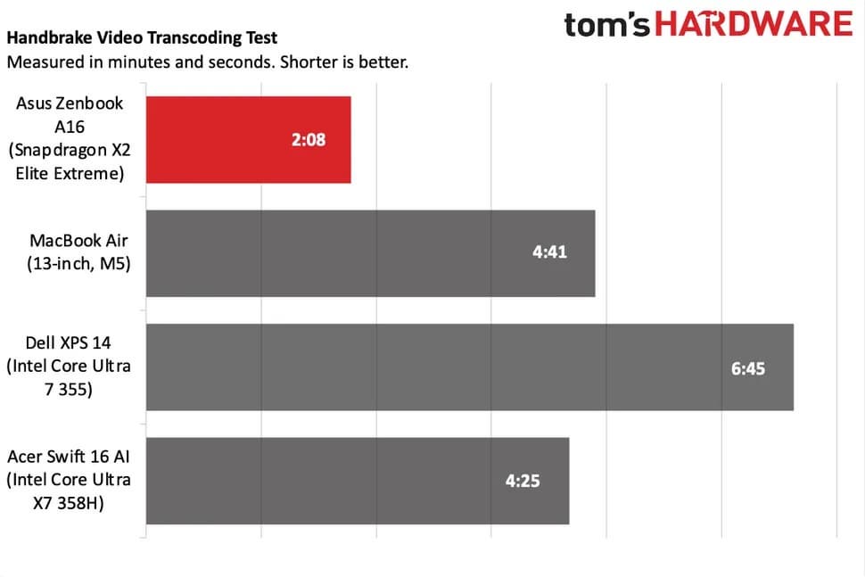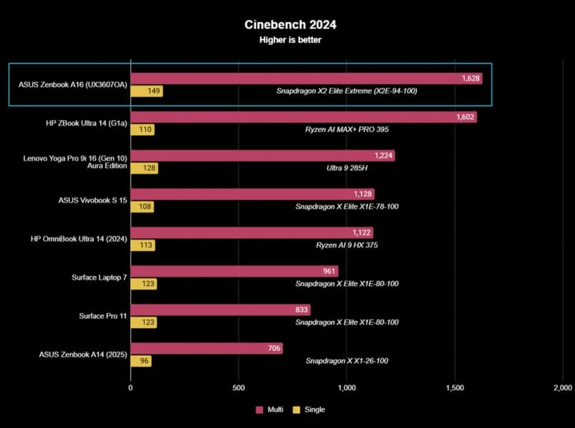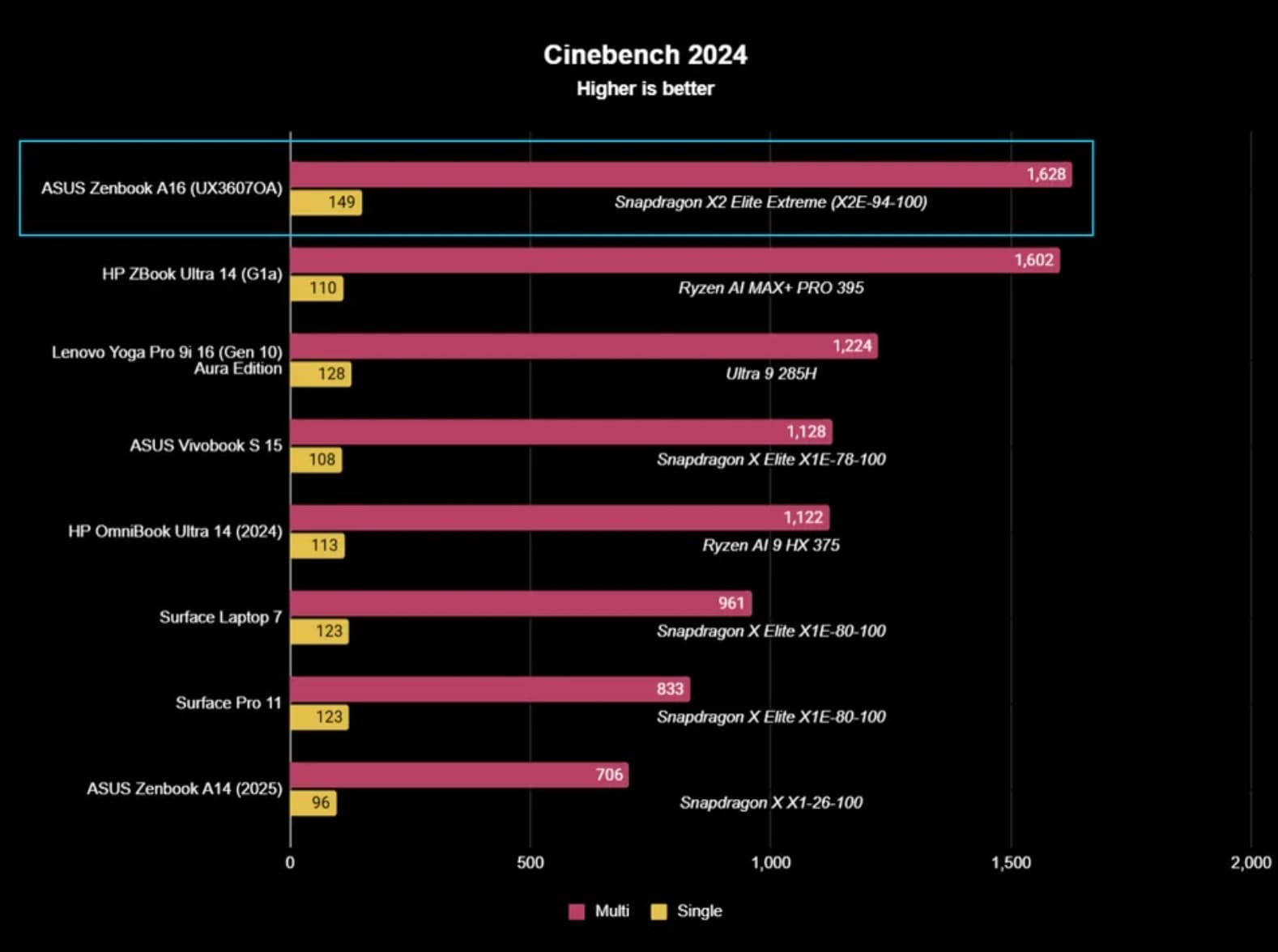 В основном обзоры разных источников были проведены на новых ноутбуках Asus с топовой Snapdragon X2 Elite Extreme (X2E-94-100) в основе. Напомним, у неё 18-ядерный CPU.