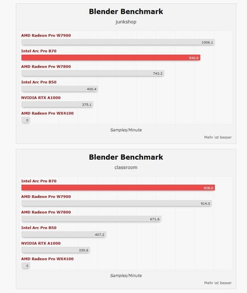 Начать же стоит с одиночной модели. Большого выбора для сравнения у авторов не было. В Blender в зависимости от сцены новинка Intel выступает то на уровне Radeon Pro W7800, то догоняет W7900. Напомним, первая на старте стоила 2500 долларов, а за вторую просили 4000 долларов, но вышли они ещё в 2023 году.