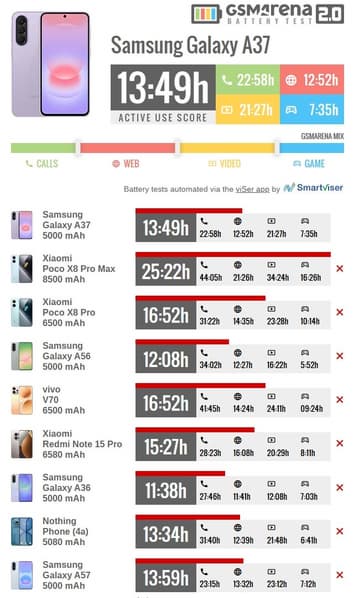 Авторы GSM Arena после обзора Samsung Galaxy A57 опубликовали обзор Galaxy A37. Оказалось, что младшая модель, как и старшая, заметно прибавила в автономности относительно предшественницы, несмотря на сохранение ёмкости аккумулятора.