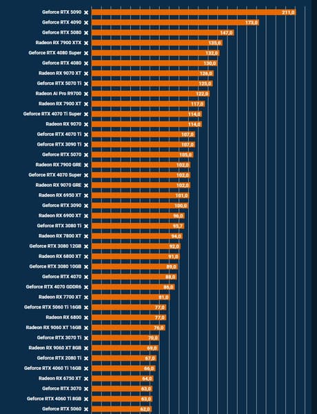 RTX 4090 тоже довольно сильно опережает все карты, кроме преемницы, а вот дальше между участниками разница зачастую невелика. Лучшей картой у AMD остаётся RX 7900 XTX, которая на пару процентов опережает RTX 4080 Super, а RX 9070 XT минимально опережает RTX 5070 Ti.
