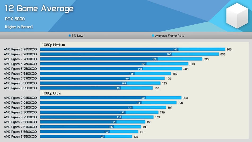 В итоге у авторов получилось девять участников от 5500X3D до 9850X3D. Конечно, тесты проводились в Full HD и с RTX 5090, что зачастую далеко от реальных сценариев использования. Однако это даёт возможность увидеть заметную разницу между CPU.