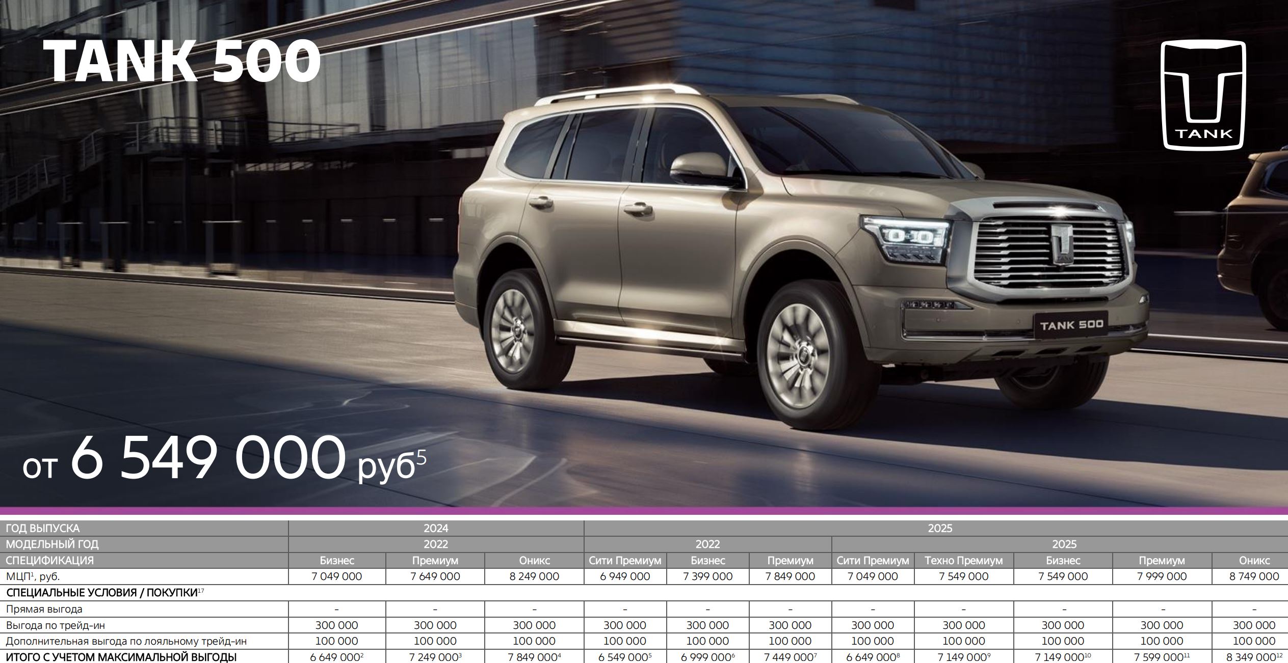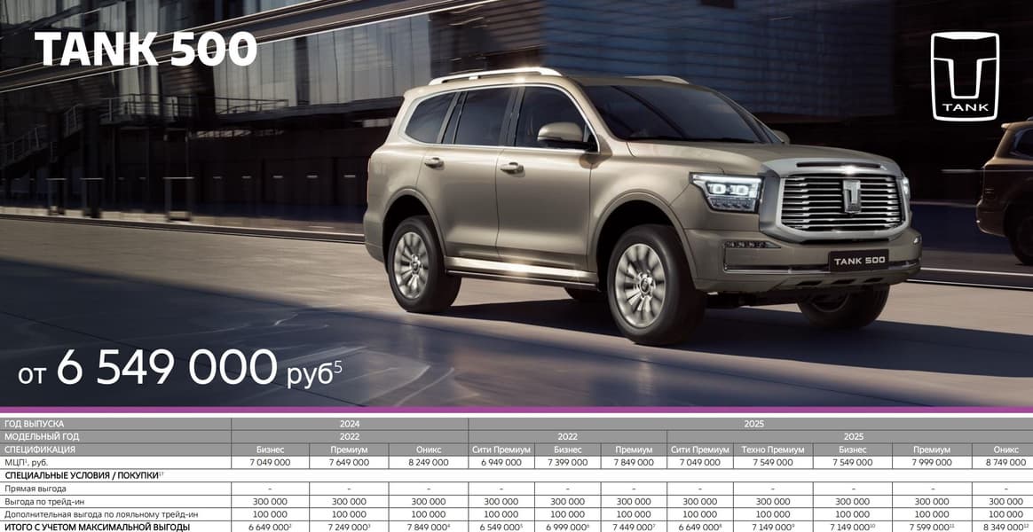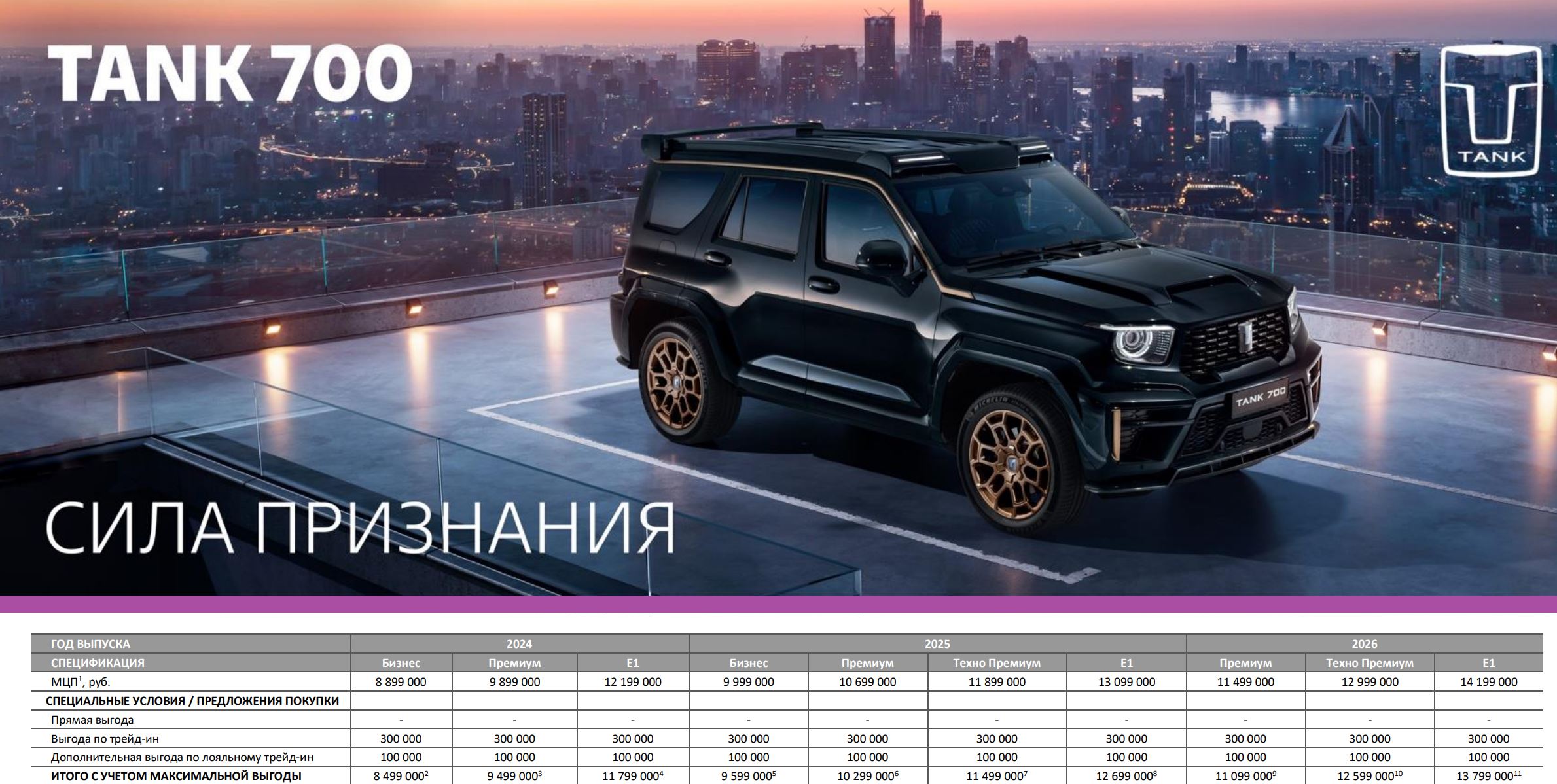 На Tank 500 больше не действует скидка в размере 100 000-300 000 рублей на версии 2024 и 2025 годов выпуска. Также сняты ранее действовавшие скидки на Tank 700: на все комплектации 2024 года — 500 000 рублей, на версию Tank 700 Edition One 2024 года выпуска — те же 500 000 рублей.