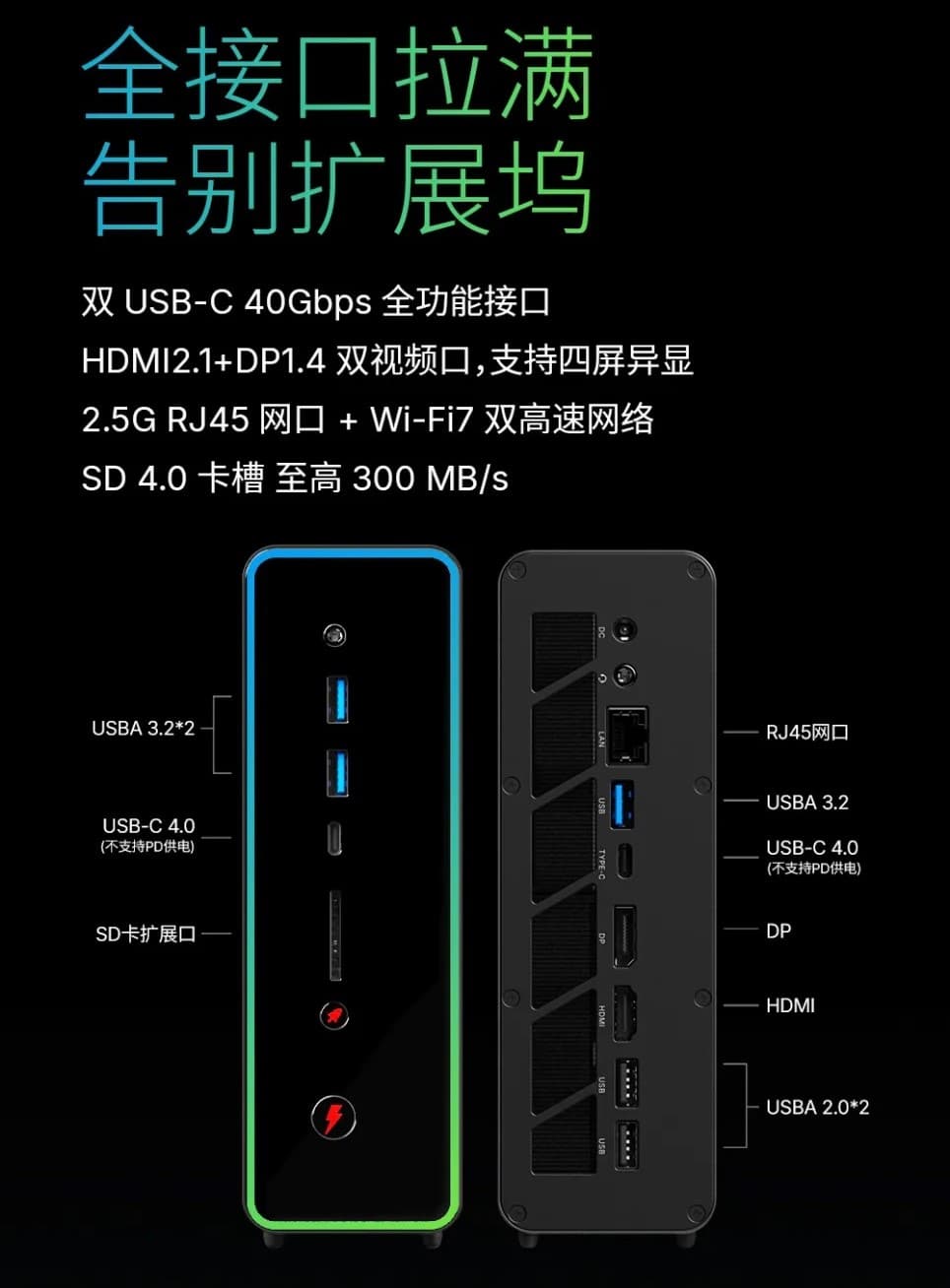 Можно отметить, что всего внутри есть место для трёх SSD. Из остального можно выделить Wi-Fi 7, RJ45 2.5GbE, два USB4, DisplayPort, HDMI, два USB 2.0, три USB 3.2 и слот для карт SD.