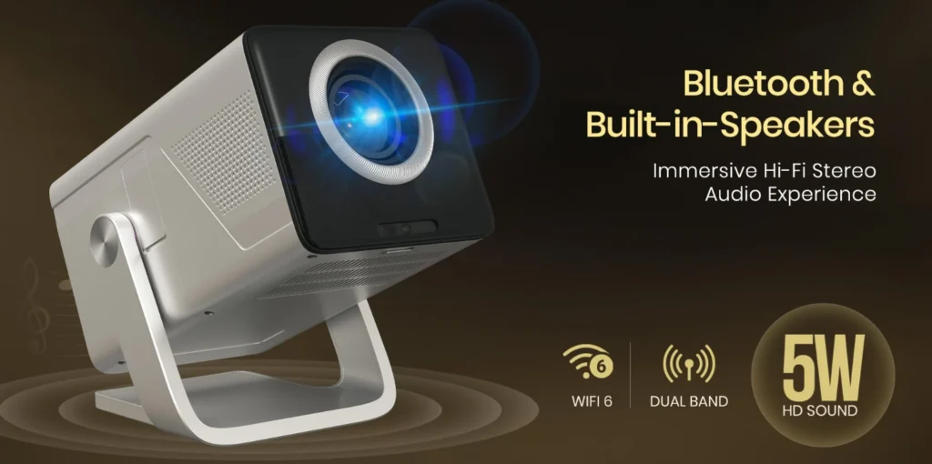 Проектор выполнен в компактном корпусе с возможностью поворота на 270 градусов, что упрощает размещение в помещении. Внутри используется система Whale TV OS на базе Android 13 с предустановленными приложениями для стриминга, включая YouTube и другие популярные сервисы, что избавляет от необходимости подключать внешние устройства.
