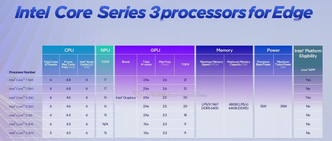 Процессоры также получили блок NPU 5 с производительностью всего 17 TOPS. Можно выделить частоты до 4,8 ГГц, поддержку DDR5-6400 и LPDDR5X-7467, TDP 15 Вт с максимумом в 35 Вт, 6 МБ кеш-памяти, два порта Thunderbolt 4, Wi-Fi 7, Bluetooth 6.0 и техпроцесс Intel 18A.