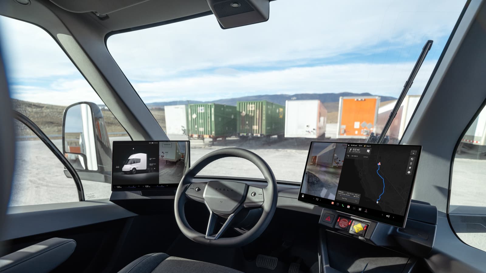 В новом Tesla Semi установлено 10 камер, включая камеру контроля внимания водителя в салоне. Боковые окна изменили таким образом, чтобы водитель мог при необходимости высунуть руку наружу. Также переработана эргономика: подстаканники переместили выше, чтобы к ним было проще дотянуться, а рядом появилась более вместительная боковая ниша для хранения.