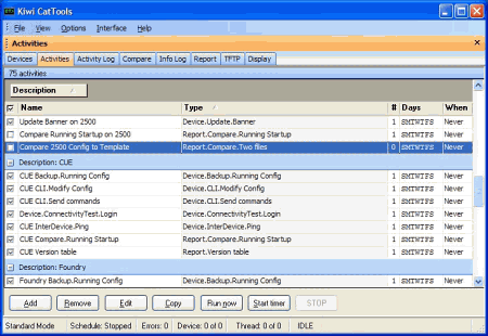 Kiwi CatTools - программа для автоматического изменения параметров конфигурации различных сетевых устройств: роутеров, свитчей и брендмауэров. Kiwi CatTools способна сохранять параметры для каждого устройства и сообщать вам по электронной почте в случае их изменения, изменять конфигурацию по расписанию в заданное время, изменять пароли для доступа к устройствам, работать по SSH, Telnet и другим протоколам.