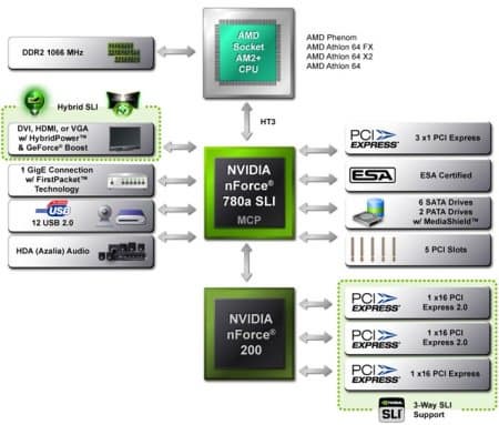 В платах на базе nForce 780a SLI будет применяться дополнительный контроллер PCI Express 2.0 NVIDIA NF200, обеспечивающий 32 линии PCIe и поддержку до трёх графических ускорителей. Сам же чипсет несет в себе поддержку 12 портов USB 2.0, гигабитный сетевой контролер, звуковой кодек Azalia HD, до 5 портов PCI и трёх PCIe x1, 6 SATA и 2 IDE.