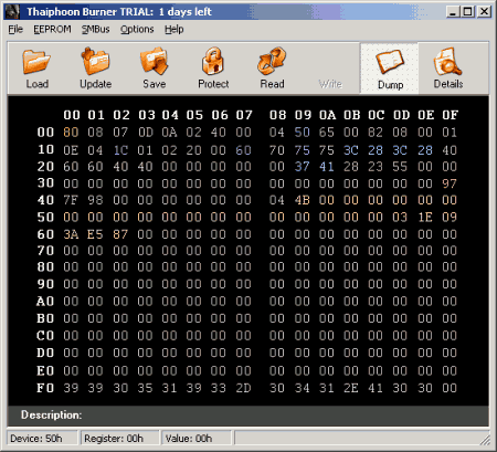 Вышла новая версия программы Thaiphoon Burner, которая разработана специально для чтения информации из SPD. Кроме того, оно позволяет перепрограммировать SPD непосредственно или в специальном режиме эмуляции. Thaiphoon Burner может загружать внешние дампы SPD и перезаписывать их в EEPROM. При работе Thaiphoon создает детальные отчеты, которые можно сохранять в отдельном файле.