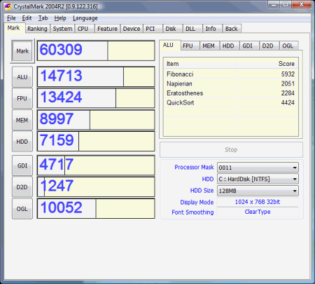 Готова новая версия CrystalMark 2004, сборника тестовых приложений, который позволяют протестировать работу процессора, памяти, HDD и видеоподсистемы (GDI, Direct Draw, OpenGL). Кроме того, программа отображает информацию о компонентах вашего ПК и позволяет сохранять результаты в текстовый или HTML файл.