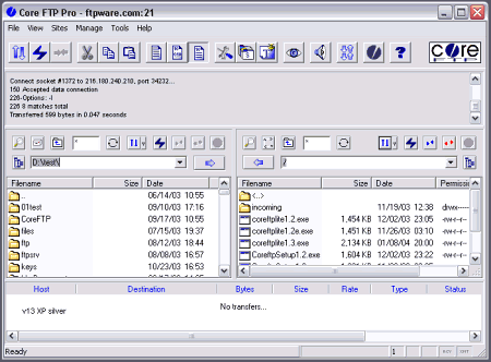 Обновился FTP-клиент Core FTP, который может работать по протоколам FTP, SSL/TLS, SSH/SFTP, HTTP/HTTPS, поддерживает пересылку файлов с сайта на сайт, интегрируется в браузер, может работать с прокси FTP/HTTP, имеет поддержку Socks 4/5. Кроме того, присутствуют опции удаленного поиска файлов, имеется менеджер закачек, автоматическое восстановление прерванной работы, редактирование htaccess. Также присутствуют и другие возможность. Рабочий интерфейс — удобны и понятный.