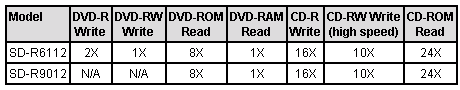 Toshiba SD-R6112 обладает поддержкой 2x записи DVD-R, 1x записи DVD-RW, 1x чтения DVD-RAM, 16x записи CD-R и 10x записи CD-RW. Модель SD-R9012 поддерживает 8x чтение DVD-ROM, 16x запись CD-R и 10x запись CD-RW. Оба привода поддерживают технологию защиты буфера записи, обладают 2 Мб буфером.